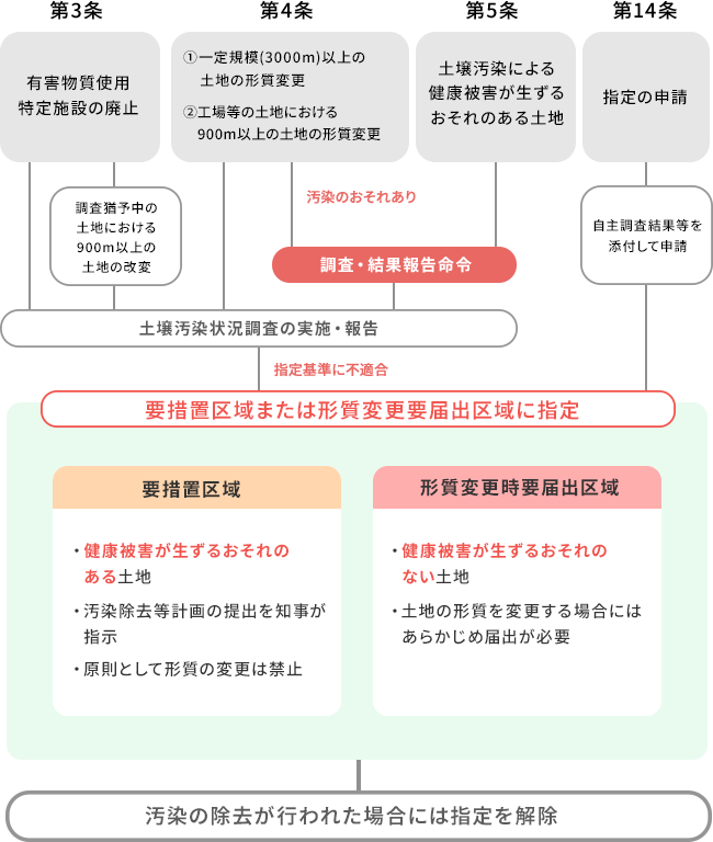一定規模(3000m2、現に有害物質使用特定施設が設置されている工場等の敷地においては900m2)以上の掘削等の土地の形質の変更を行おうとするものは、形質の変更に着手する30日前までに、一定規模以上の土地の形質の変更届出書を都道府県知事に届け出なければならない。土地所有者等は、あらかじめ土壌汚染状況調査を指定調査機関に実施させ、土地の形質の変更の届出書にあわせて、調査結果を提出することができる。なお、都道府県知事は、土地の形質の変更の届出を受けた場合において、当該土地が特定有害物質に汚染されているおそれがあると認めるときは、土地の所有者等に対して、当該土地の土壌汚染の状態を指定調査機関に調査させて、 その結果を都道府県知事に報告すべきことを命ずることができる。 - 土壌汚染による健康被害のおそれのある土地の調査(法第5条)