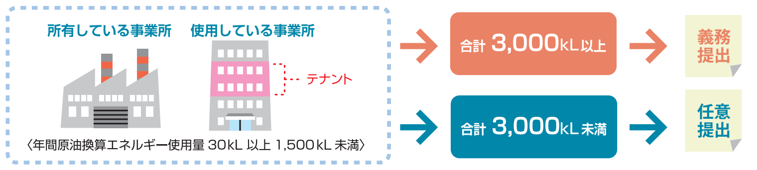 なお、大規模事業所は本報告書制度の対象外ですが、大規模事業所内の一部を使用するテナントについては、原則として、本報告書制度の対象となります。(※特定テナント等事業者の事業所は対象外)