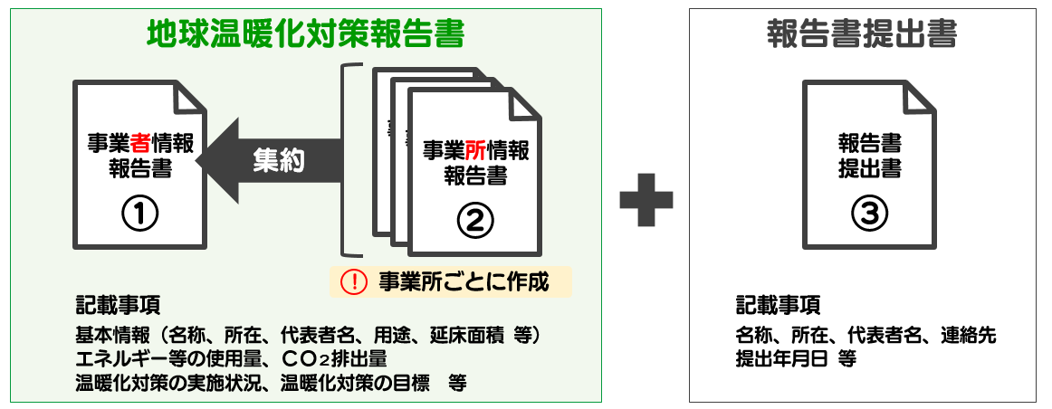 各事業所等ごとに、エネルギー使用量を把握(報告書その2)し、事業者単位でとりまとめをし、東京都へ、電子データもしくは紙面にて提出をします。
