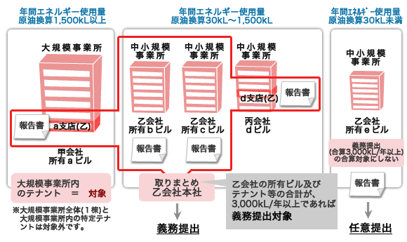 同一事業者が都内に設置している事業所等(前年度の原油換算エネルギー使用量が30kL以上1,500kL未満の事業所等)の前年度の原油換算エネルギー使用量の合計が年間3,000kL以上になる場合、この事業者の方には、事業所等の報告書を取りまとめて提出する義務と公表の義務が課せられます。