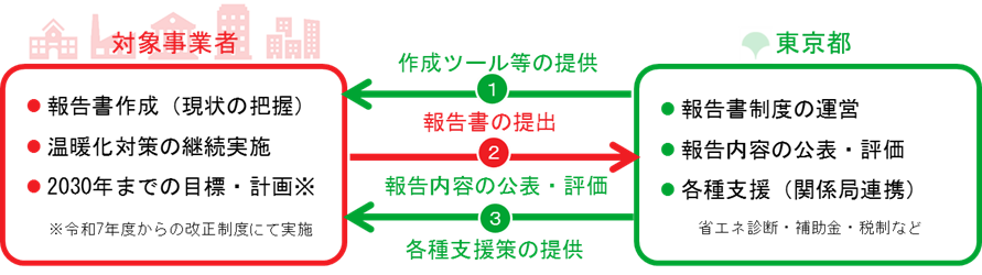 2010(平成22)年度に開始した本制度は、都内の全ての中小規模事業所での地球温暖化対策の底上げを図るため、地球温暖化対策報告書に取り組むことで、二酸化炭素排出量を把握し、具体的な省エネルギー対策を実施していただき、実質的に事業活動に伴う二酸化炭素の排出抑制の推進を図ってきました。2025(令和7)年度からは、都が目指す、2030年カーボンハーフ実現に向けて更なる省エネと再エネの利用促進を目的として制度を改正します。
