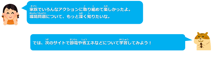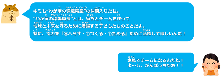こどもが「環境局長」になって、家族で楽しみながら節電対策などの環境アクションに取り組む様子や、