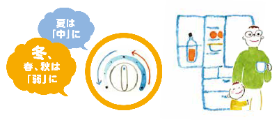 - 冬・春・秋は、冷蔵庫の設定を「弱」に(「強」よりも庫内温度は高くなりますが、食材の保存に適さない温度ではありません)