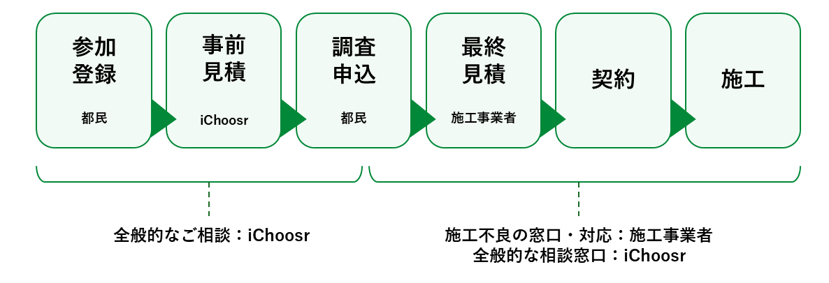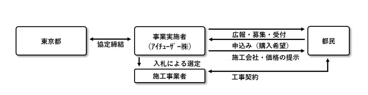 本事業においては、アイチューザー株式会社が事務局となり、参加登録者の問い合わせ対応や施工事業者の審査(施工実績や経営状況等)と入札の実施を担っています。