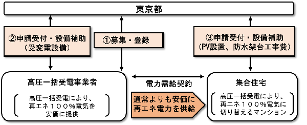 都では、集合住宅の建物全体に再エネ100%電気導入を促進するため、高圧一括受電設備や太陽光発電設備の設置等に係る経費を助成する事業を実施します。