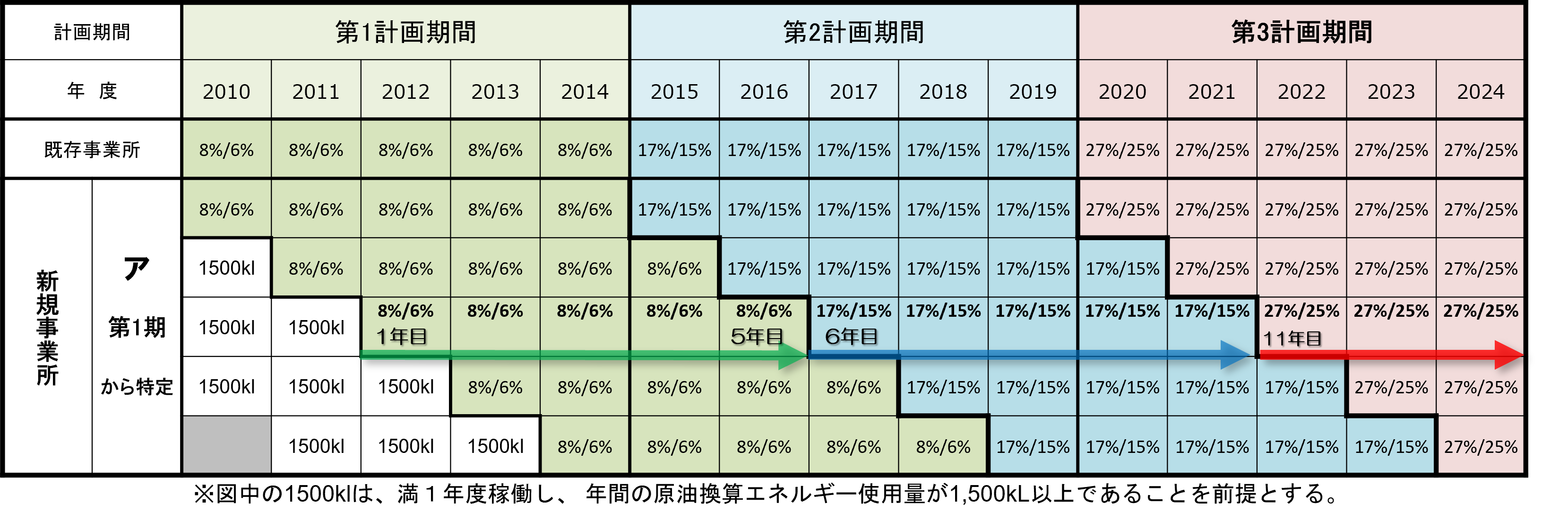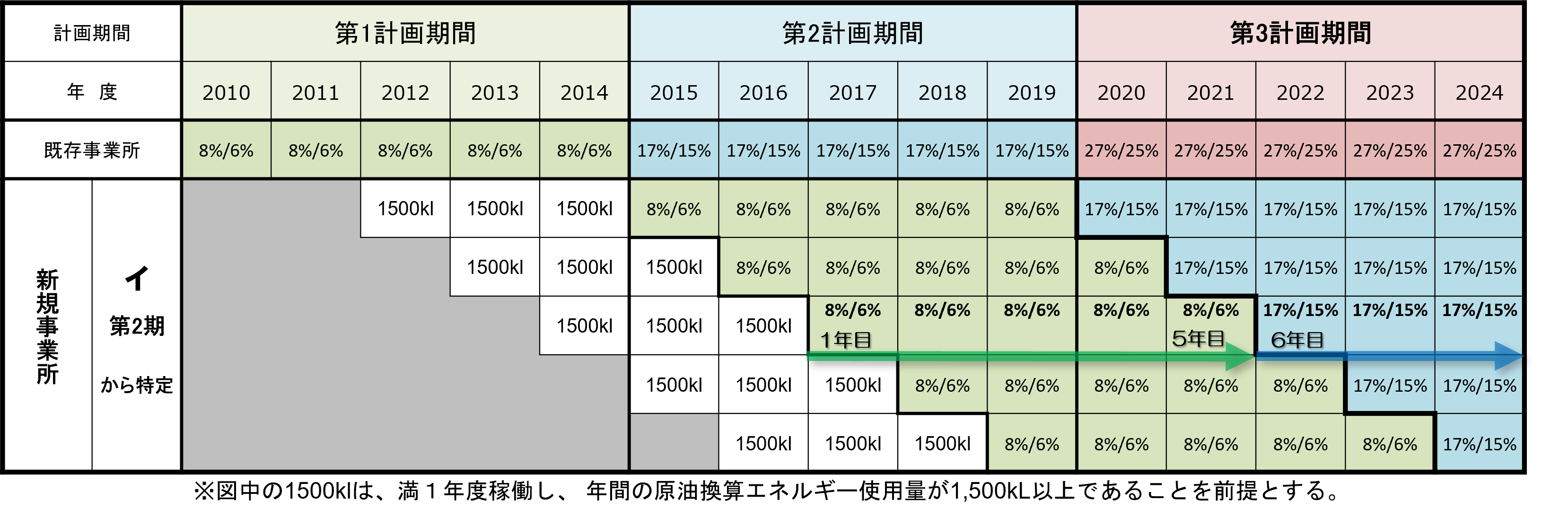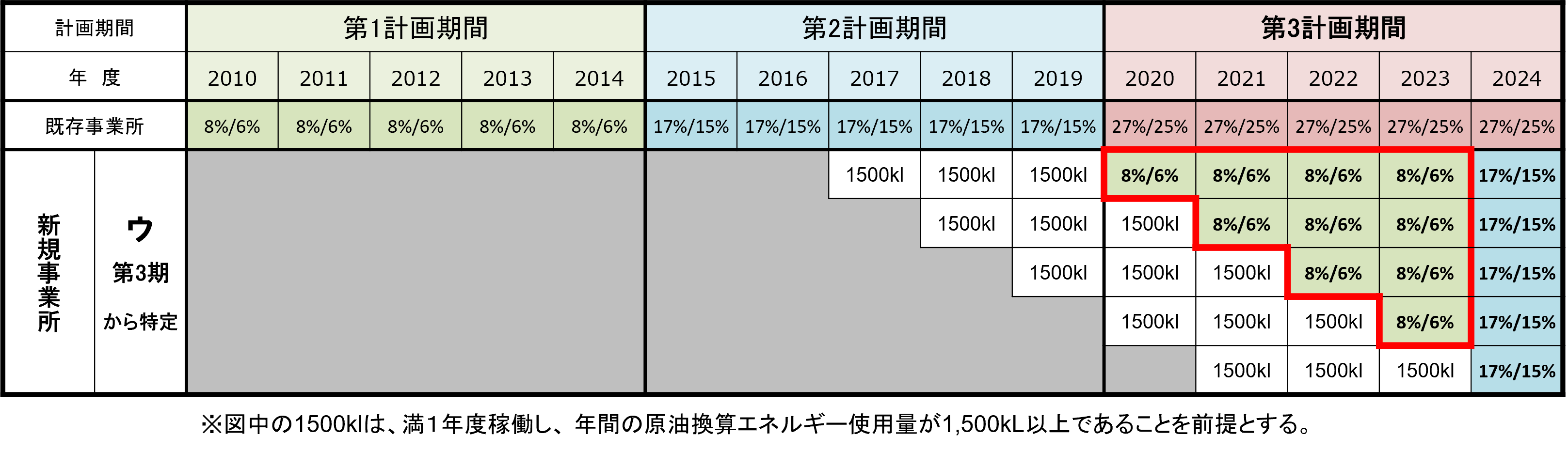 2020年度途中に稼働している事業所は、2021年度、2022年度、2023年度に原油換算エネルギー使用量が1,500L以上の場合、2024年度から特定地球温暖化対策事業所となり、削減義務が発生することになります。
