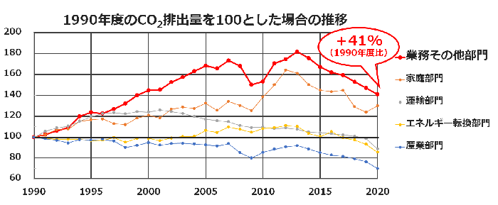 一方で、2020年度の 業務部門(事務所、商業施設等)CO2排出量は、1990年度比で41% 多く、これを削減することが重要な課題となっています。