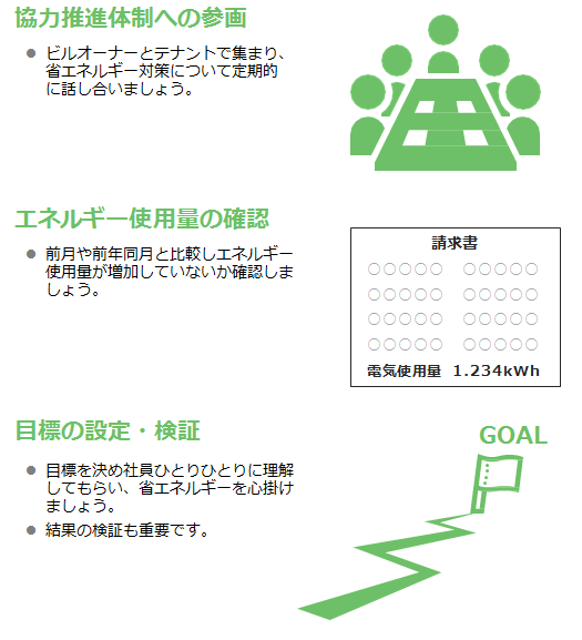 義務を履行するに当り、テナント等事業者には以下のような行動が推奨されます。省エネ活動を進め、ビルオーナーの総量削減義務( 詳細はこちら )達成に向け積極的に協力していきましょう!