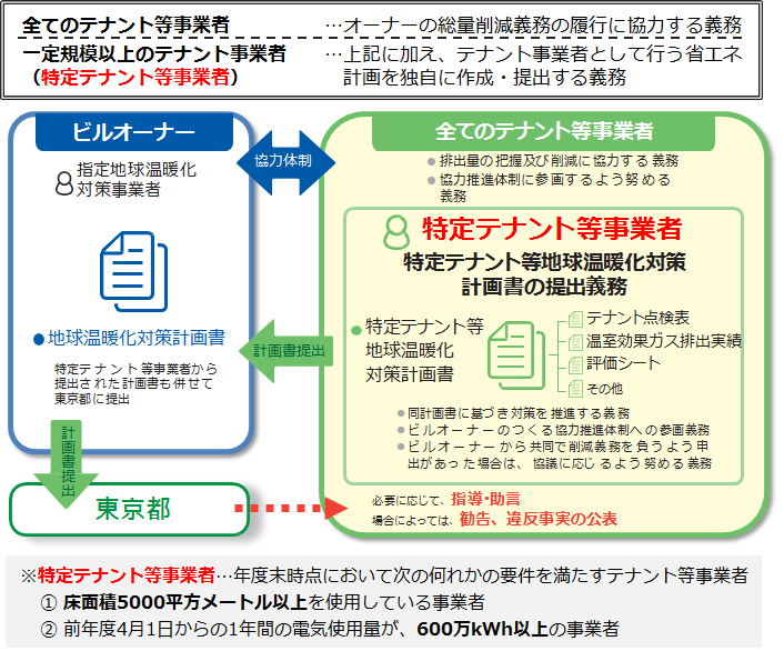 そこで都は、効果的な温室効果ガス削減のため、テナント等事業者に対して以下の義務を設け、テナントの省エネ対策を推進しています。