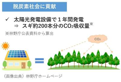 4kWの太陽光発電によるCO2削減量は、スギ林 2,000平方メートル分(約200本分)の吸収量に相当します。