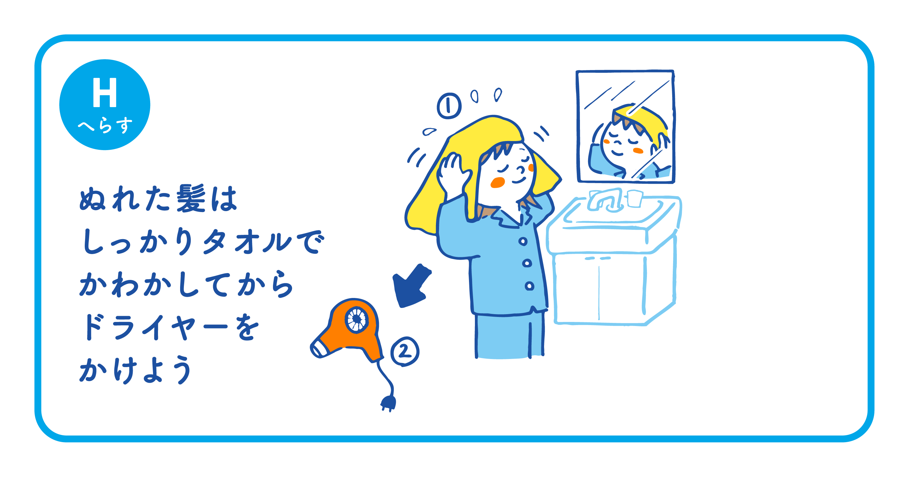 Ⓗぬれた髪はしっかりタオルでかわかして ドライヤーをかけよう
