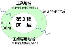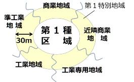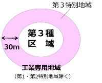 | 種別が2段階以上異なる区域が接している場合、基準の厳しい区域の周囲30m以内の地域を 特別地域 とする(条例別表 第7より) | ||