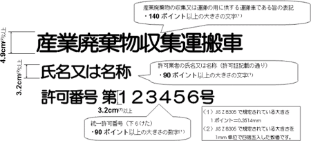 運搬車を用いて産業廃棄物の収集又は運搬を行なう際には、以下の事項を車体の両側面に見やすいように表示しておくこと。