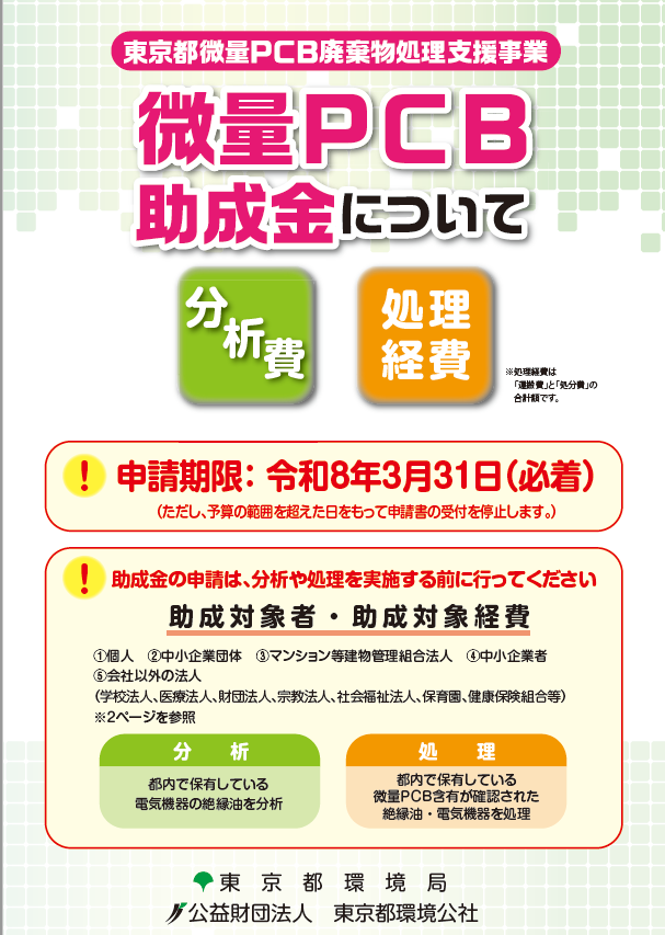 東京都は、中小企業等の皆様の負担を軽減し、処理を促進するため、微量PCB廃棄物分析・処理費用の助成制度を実施しています。