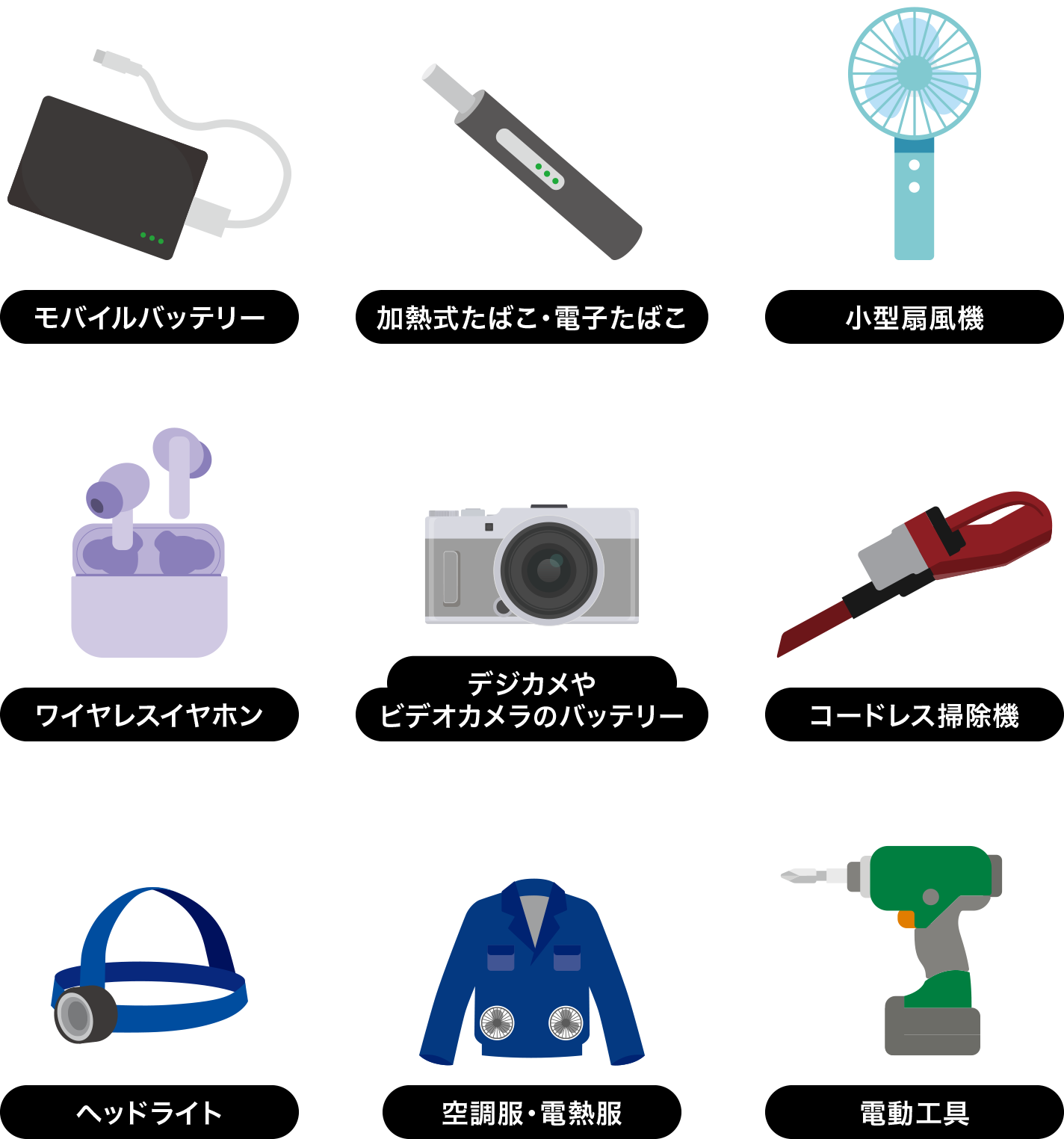 モバイルバッテリー、パソコン、デジタルカメラ、携帯型ゲーム機、