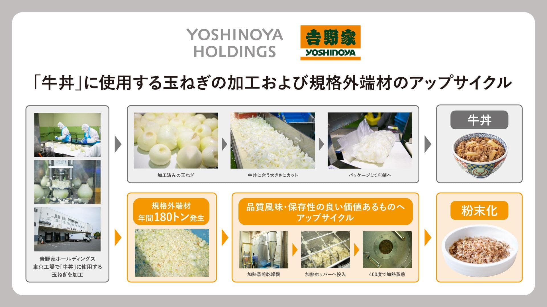吉野家・はなまるの工場では、食品リサイクル率100%を達成しており、現在は食品以外の廃棄物削減にも取り組んでいる。店舗では、油脂回収の強化や食べ残し削減、販売予測の精度向上による仕入れ量の適正化を進め、食材のロスを抑える努力を続けている。
